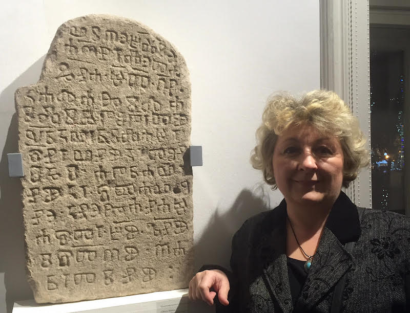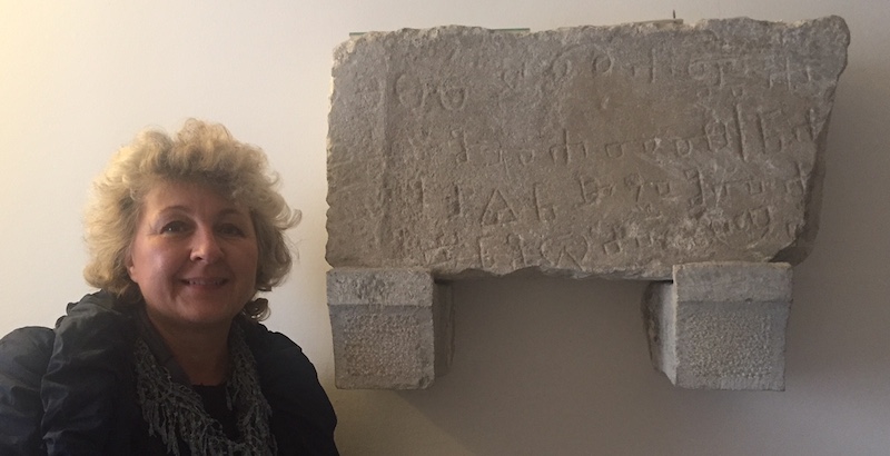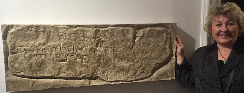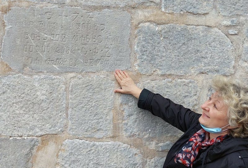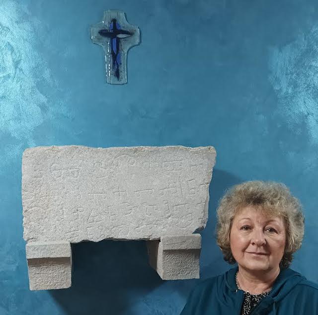 Mirna Lipovac kraj znamenitog Krčkog nadpisa iz 11. st. (prema dr. Marici Čunčić iz 10. st.).
